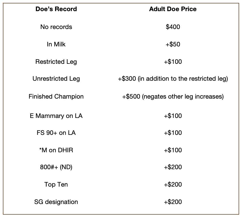 Kids are priced primarily based on the success of the dam in performance programs outlined on the adjacent chart. Does with exceptional records or special breedings may be priced higher than what is listed. We breed both for conformation/show performance and milk production, as it is our firm belief that a beautifully built animal with a beautiful mammary system will fill the bucket as well. We not only love a gorgeous animal, we need them to be a productive member of the family as well.